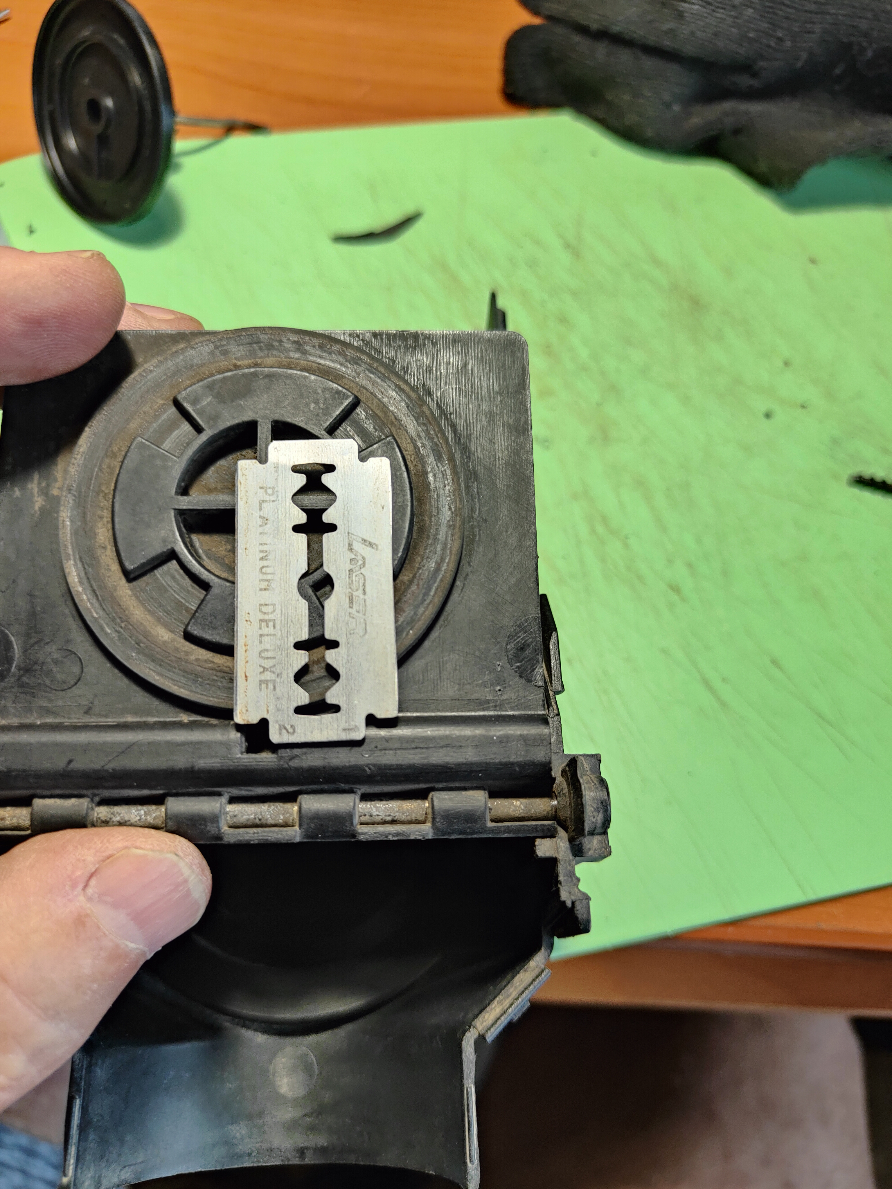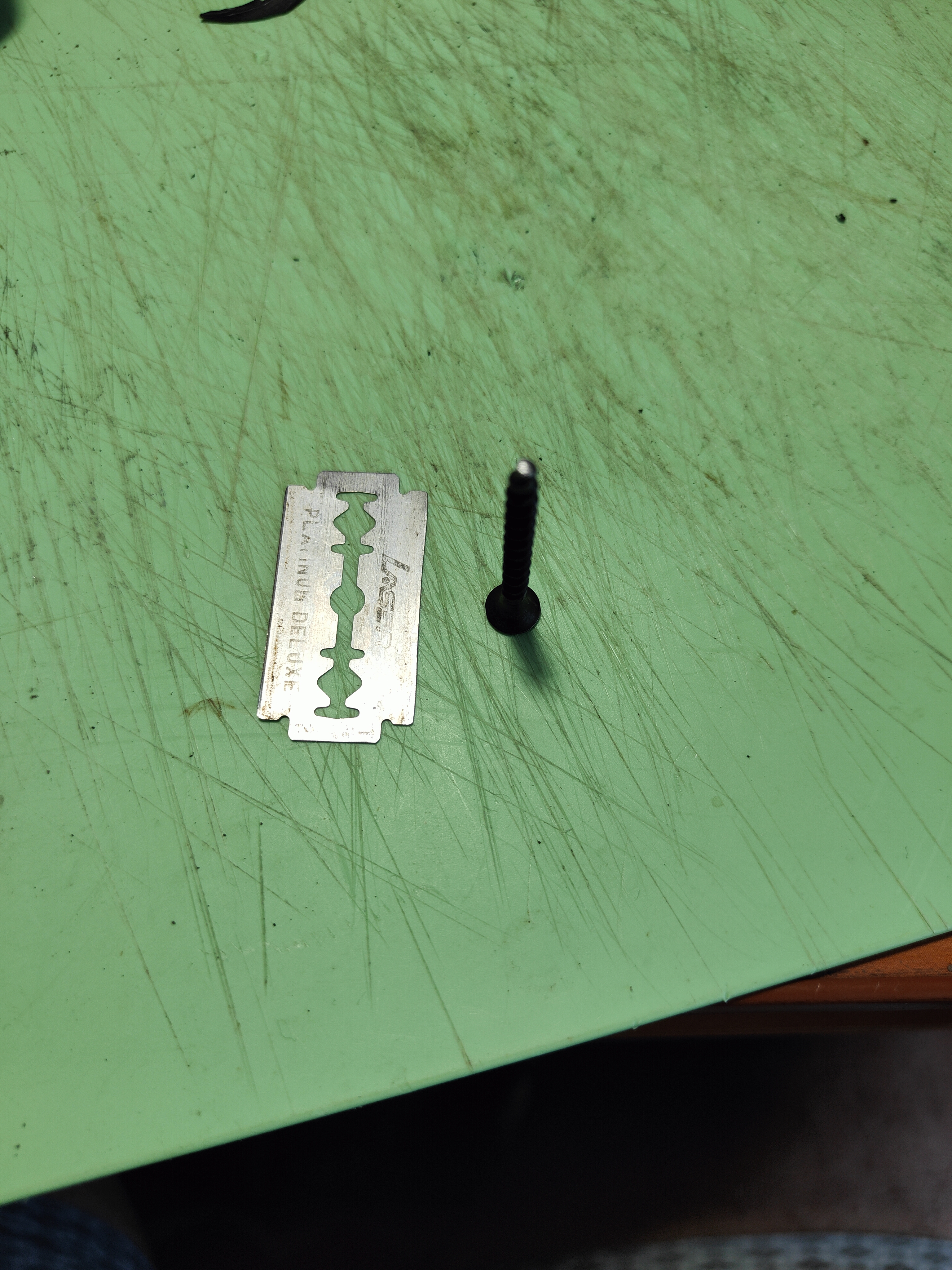 НА случай, если через какое то время начнёт переключение снова барахлить, решил сделать ручное механическое открывание саморезом (подсмотрел в Ютюбе, кто то такое приколхозил на наших машинках). Саморезом нраметил две точки (начало открывания и полное открытие) и ни их место приклеил кусочек от бритвы, чтобы не портить пластик мембраны. Сам саморез откусил и конец сделал круглым.